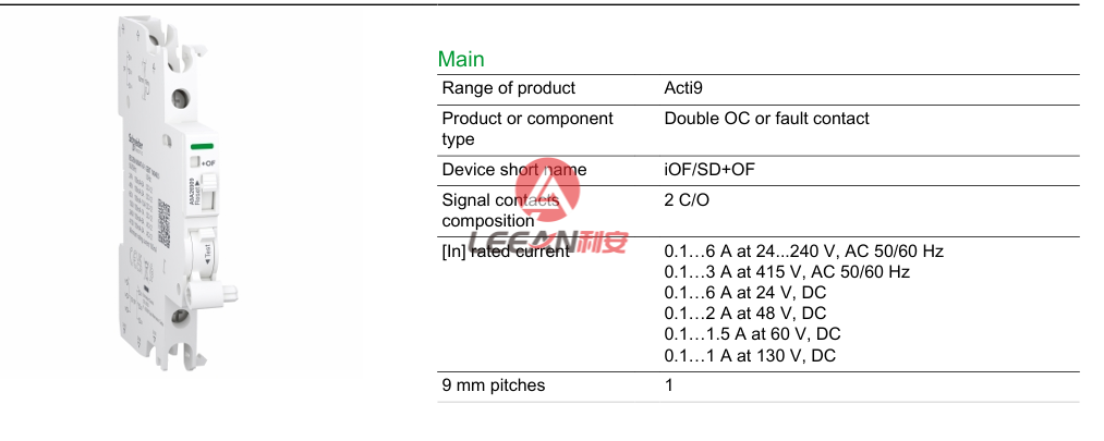 Schneider Electric A9A26909 Auxiliary contact, Acti9 A9A, iOF/SD+OF, 2 C/O, 100mA to 6A, 24VAC to 415VAC, 24VDC to 130VDC, top and bottom connection New