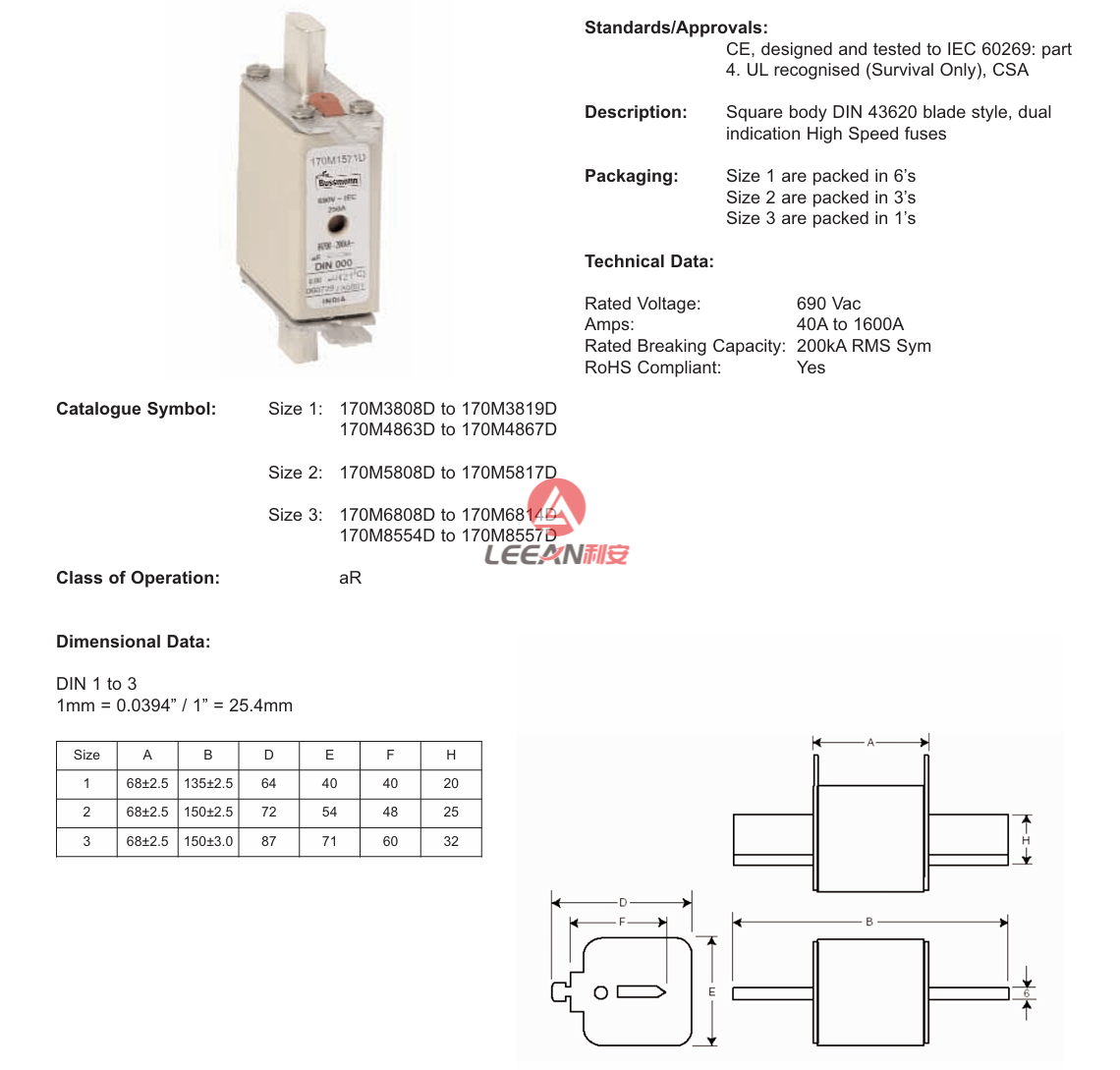 The Eaton Bussmann Series 170M5810D High-Speed Square Body Fuse is your ultimate solution for efficient circuit protection. Designed for demanding applications, this fuse operates at 700V (UL) and 690V (IEC) with an impressive current rating of 500A and a breaking capacity of 200 kAIC. Its combination fuse status indicator ensures quick diagnostics, while the DIN 43-620 blade ends provide easy installation and compatibility. Classified under Class aR, this fuse is a trusted choice for photovoltaic and industrial setups.